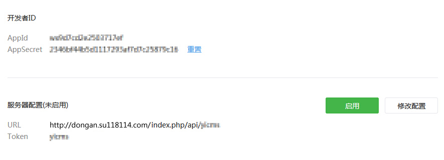 2、进入开发者中心之后,点击下图中绿色的“启用”按钮(如果按钮是红色的就忽略这个直接进入下一步),然后在弹出的页面里点击确定,然后点击下图中的“修改配置”(订阅号的开发者中心可能没有开发者ID、AppId和AppSecret,这属于正常的)